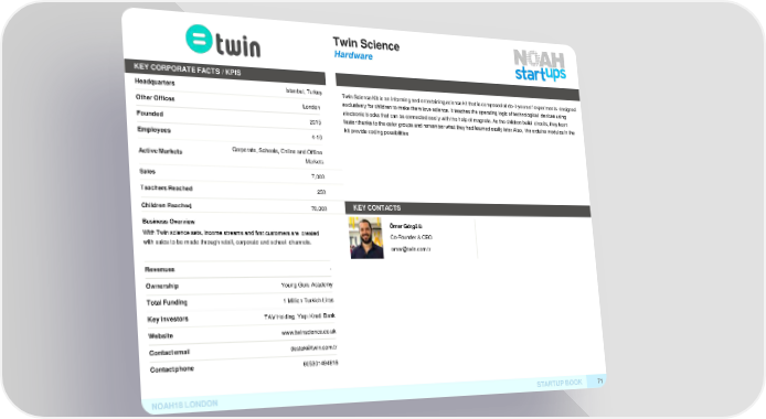 TwinScience Hardware KEY CORPORATE FACTS /KPIS COMPANYDESCRIPTION Headquarters İstanbul, TurkeyTwin Science Kit is an informing and entertaining science kit that is composed of do-it-yourself experiments designed OtherOffices London exclusively for children to make them love science. It teaches the operating logic of technological devices using electronic blocks that can be connected easily with the help of magnets. As the children build circuits, they learn Founded 2015 faster thanks to the color groups and remember what they had learned easily later.Also, the arduino modules in the kit provide coding possibilities Employees 4-10 ActiveMarkets Corporate, Schools, Online and Offline Markets Sales 7,000 TeachersReached 250 Children Reached 70,000 KEYCONTACTS Business Overview Ömer Görgülü With Twin science sets, income streams and first customers are created Co-Founder & CEO with sales to be made through retail, corporate and school channels. [email protected] Revenues - Ownership Young Guru Academy TotalFunding 1 Million Turkish Liras KeyInvestors TAV Holding, Yapı Kredi Bank Website www.twinscience.co.uk Contactemail [email protected] Contactphone 905301494816 NOAH18LONDON STARTUPBOOK 71