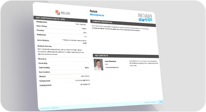 Relok Marketplaces KEY CORPORATE FACTS /KPIS COMPANYDESCRIPTION Headquarters Berlin, GermanyRelok is the first full service B2B marketplace for construction waste and bulk goods such as sand, gravel, OtherOffices Krefeld concrete and asphalt. We offer the easiest way to find, compare and contract suppliers. Founded 2018 Employees 4-10 ActiveMarkets Trading of construction waste and bulk goods. Business Overview Berlin based early stage start-up, lead by a team with deep industry connections, solving specific problems in a highly fragmented and low digitised market environment KEYCONTACTS Revenues - Lukas Hamelmann is civil engineer and entrepreneur, Lukas Hamelmann Ownership - CEO who funded two companies in the construction and real estate sector. TotalFunding €200k l.hamelmann@relok.de KeyInvestors - Website www.relok.de Contactemail l.hamelmann@relok.de Contactphone +491604481010 NOAH18LONDON STARTUPBOOK 111