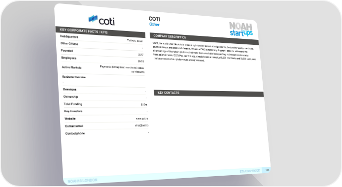 COTI Other KEY CORPORATE FACTS /KPIS COMPANYDESCRIPTION Headquarters Tel-Aviv, Israel COTI, the world’s first blockchain protocol optimized for decentralized payments, designed for use by merchants, OtherOffices - payment dApps and stable coin issuers. We use a DAG (directed acyclic graph) ledger to address all the shortcomings of blockchain platforms that make them unsuitable for supporting mainstream and everyday Founded 2017 transactional needs. COTI Pay, our first app, already boasts a network of 5,000 merchants and 80,000 users, and the beta version of our platform was already released. Employees 26-50 ActiveMarkets Payments (Enterprises/ merchants/ stable coin issuers) Business Overview - Revenues - KEYCONTACTS Ownership - TotalFunding $15m KeyInvestors - Website www.coti.io Contactemail [email protected] Contactphone - NOAH18LONDON STARTUPBOOK 144