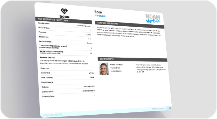Bcon Hardware KEY CORPORATE FACTS /KPIS COMPANYDESCRIPTION Headquarters Karlsruhe, GermanyAll hands busy in front of PC or you can't use your hands at all? No problem, we bring the foot or head into play. OtherOffices - SIMPLY do more. The Bcon is a pat.pend. bluetooth controller used in addition to (or instead of) keyboard and mouse for more productivity and comfort. The wearable translates easy movements in configurable actions and Founded 8/2017 works with all software 'plug-and-play' - also on smart devices. Employees 4-10 ActiveMarkets Europe Time from first prototype toserial 9 production (inmonths) Market test oncrowdfunding 65k (volume achieved inUSD) Business Overview KEYCONTACTS The start-up behind the Bcon is legally called CapLab GmbH (for Capability Lab or Control-and-Perform). We developed and designedCarsten van Husen Trade-selling his 1st start-up in 2000, Carsten Revenues - Founder & CEO (Diploma WHU, MBA) was CEO of online games carsten@caplab.io company Gameforge, partaking in growing it from 12 Ownership private to >500 staff TotalFunding €500k KeyInvestors - Website www.bcon.zone Contactemail carsten@caplab.io Contactphone - NOAH18LONDON STARTUPBOOK 69