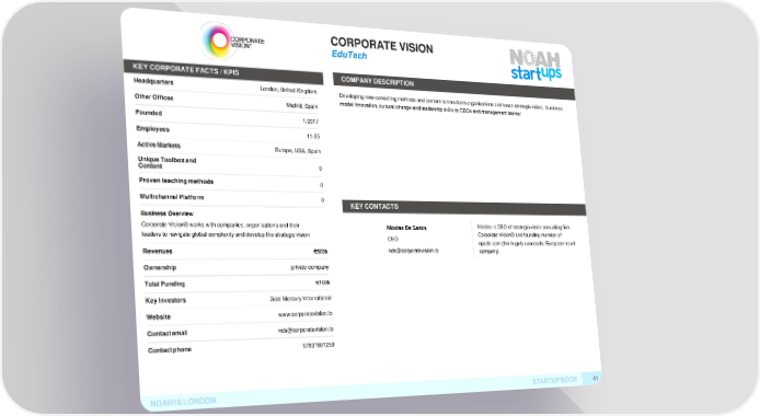 CORPORATEVISION EduTech KEY CORPORATE FACTS /KPIS COMPANYDESCRIPTION KEY CORPORATE FACTS /KPIS Headquarters London, United KingdomDeveloping new consulting methods and content to transform organisations and teach strategic vision, business OtherOffices Madrid, Spain model innovation, cultural change and leadership skills to CEOs and management teams! Founded 1/2017 Employees 11-25 ActiveMarkets Europe, USA, Spain Unique Toolboxand 0 Content Proven teachingmethods 0 MultichannelPlatform 0 KEYCONTACTS Business Overview Corporate Vision® works with companies, organisations and their Nicolas De Santis Nicolas is CEO of strategic vision consulting firm leaders to navigate global complexity and develop the strategic visionCEO Corporate Vision® and founding member of opodo.com (the hugely successful European travel Revenues [email protected] €500k company) Ownership private company TotalFunding €100k KeyInvestors Gold Mercury International Website www.corporatevision.io Contactemail [email protected] Contactphone 07831801259 NOAH18LONDON STARTUPBOOK 41