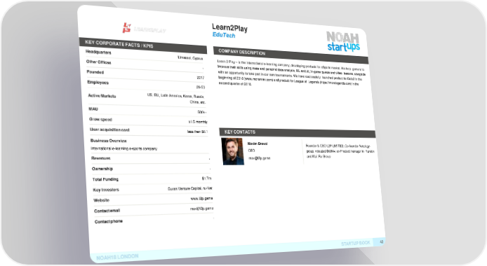 Learn2Play EduTech KEY CORPORATE FACTS /KPIS COMPANYDESCRIPTION Headquarters Limassol, CyprusLearn 2 Play – is the international e-learning company, developing products for eSports market. We help gamers to OtherOffices - improve their skills using meta and personal data analysis, ML and AI, in-game quests and video lessons, alongside with an opportunity to take part in our own tournaments. We have successfully launched product for Dota2 in the Founded 2017 beginning of 2018 (www.moremmr.com) and product for League of Legends (https://morelegends.com) in the second quarter of 2018. Employees 26-50 ActiveMarkets US, EU, Latin America, Korea, Russia, China, etc. MAU 500k+ Growspeed x1.5 monthly User acquisitioncost less then $0.1 KEYCONTACTS BusinessOverview Maxim Dreval Founder & CEO L2P LIMITED; Co-founder Netology- International e-learning e-sports company CEO group, valuated $60M+; ex Product manager in Yandex Revenues - [email protected] and Mail.Ru Group Ownership - TotalFunding $1.7m KeyInvestors Buran Venture Capital, ru-Net Website www.l2p.game Contactemail [email protected] Contactphone - NOAH18LONDON STARTUPBOOK 42