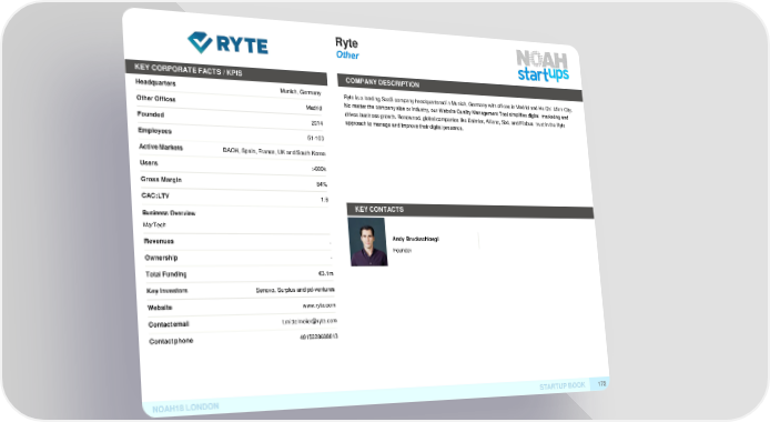 Ryte Other KEY CORPORATE FACTS /KPIS COMPANYDESCRIPTION Headquarters Munich, Germany Ryte is a leading SaaS company headquartered in Munich, Germany with offices in Madrid and Ho Chi Minh City. OtherOffices Madrid No matter the company size or industry, our Website Quality Management Tool simplifies digital marketing and drives business growth. Renowned, global companies like Daimler, Allianz, Sixt, and Flixbus trust in the Ryte Founded 2014 approach to manage and improve their digital presence. Employees 51-100 ActiveMarkets DACH, Spain, France, UK and South Korea Users >600k GrossMargin 84% CAC:LTV 1:6 KEYCONTACTS Business Overview MarTech Revenues - Andy Bruckschloegl Founder Ownership - TotalFunding €3.1m KeyInvestors Senovo, Surplus and pd-ventures Website www.ryte.com Contactemail t.mittelmeier@ryte.com Contactphone 4915228688813 NOAH18LONDON STARTUPBOOK 172