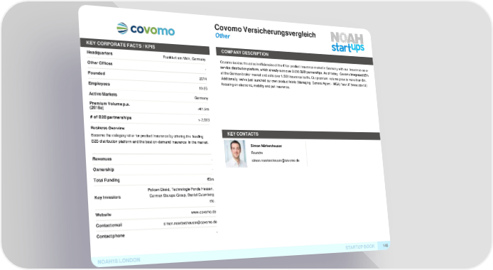CovomoVersicherungsvergleich Other KEY CORPORATE FACTS /KPIS COMPANYDESCRIPTION Headquarters Frankfurt am Main, GermanyCovomo tackles the sales inefficiencies of the €11bn product insurance market in Germany with our insurance-as-a- OtherOffices - service distribution platform, which already won over 2.000 B2B partnerships. As of today, Covomo integrated 85% of the German broker market and sells over 1.500 insurance tariffs. Our premium volume grew to more than €1m. Founded 2014 Additionally, we've just launched our own product fabric (Managing General Agent - MGA) "covr.it" (www.covr.it ) focusing on electronic, mobility and pet insurance. Employees 10-25 ActiveMarkets Germany Premium Volumep.a. >€1.5m (2018e) # of B2Bpartnerships > 2,000 Business Overview KEYCONTACTS Become the category killer for product insurance by offering the leading B2B distribution platform and the best on-demand insurance in the market.Simon Nörtersheuser Founder Revenues - simon.noertersheuser@covomo.de Ownership - TotalFunding €3m Policen Direkt, Technologie Fonds Hessen, KeyInvestors German Starups Group, Daniel Gutenberg etc. Website www.covomo.de Contactemail simon.noertersheuser@covomo.de Contactphone - NOAH18LONDON STARTUPBOOK 145