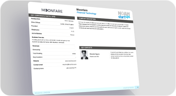 Moonfare FinancialTechnology KEY CORPORATE FACTS /KPIS COMPANYDESCRIPTION Headquarters Berlin, Germany Until now, the majority of individuals have had limited or no ability to access top-tier private equity managers. OtherOffices London, United KingdomThese managers are not equipped to communicate and transact with thousands of individual investors and independent advisors. Moonfare provides qualified investors with access to top-tier private equity funds at lower Founded 01/2017 minimums and lower fees than previously possible. Employees 11-25 ActiveMarkets Europe Business Overview Investing starts with as little as $100,000 in funds that typically have multi-million dollar minimums. With Moonfare, individuals Revenues - KEYCONTACTS Ownership - Alexander founded Moonfare and drives the team's TotalFunding €10m Alexander Argyros strategy and daily execution. He brings deep KeyInvestors - Founder and CEO entrepreneurial experience and previously worked for many years at Website www.moonfare.com/ Contactemail enquiries@moonfare.com Contactphone +49 30 220 560 771 NOAH18LONDON STARTUPBOOK 61