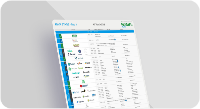 MAIN STAGE - Day 1 13 March 2018 COMPANY TIME COMPANY / SESSION TITLE SPEAKER POSITION 9:00 - 10:00 Breakfast 9:30 - 9:35 Welcome Note K NOAH Advisors Marco Rodzynek Founder & CEO ® FC 9:35 - 9:45 AppCard Yair Goldfinger MR Co-Founder & CEO K 9:45 - 9:55 Venture Capital Enviroment in Europe, Israel and US Vintage Investment Partners Abe Finkelstein General Partner 9:55 - 10:05 Colu Amos Meiri CEO CP 10:05 - 10:15 Bancor Eyal Hertzog Co-Founder Crypto 10:15 - 10:25 Orbs Tal Kol Co-Founder Currencies 10:25 - 10:35 Barrel Protocol Jonathan Meiri Founder & CEO K 10:35 - 10:45 Viola Ronen Nir General Partner CP 10:45 - 10:55 Behalf Benjy Feinberg CEO FC 10:55 - 11:05 Payoneer Keren Levy MR COO 11:05 - 11:15 Zeek Daniel Zelkind Co-Founder & CEO CP 11:15 - 11:25 Simplex Nimrod Lehavi Co-Founder & CEO 11:25 - 11:35 eToro Yoni Assia Founder & CEO Fintech FC 11:35 - 11:45 Investing.com Dror Efrat MR Founder & CEO CP 11:45 - 11:55 SafeCharge Nicolas Vedrenne CBDO 11:55 - 12:05 Lemonade Shai Wininger MR Co-Founder FC 12:05 - 12:15 VATBox Isaac Saft Founder & CEO Target Global Shmuel Chafets General Partner K 12:15 - 12:25 Jfrog Shlomi Ben Haim Co-Founder & CEO K 12:25 - 12:35 Pitango Rami Beracha General Partner 12:35 - 12:45 Optibus Amos Haggiag Co-Founder & CEO 12:45 - 12:55 Gett Dave Waiser Founder & CEO CP 12:55 - 13:05 Autotalks Hagai Zyss CEO 13:05 - 13:15 Vayavision Ronny Cohen CEO Electric & 13:15 - 13:25 StoreDot Doron Myersdorf Founder & CEO 13:25 - 13:35 Arbe Robotics Kobi Marenko Co-Founder & CEO Autonomous CarsFC 13:35 - 13:45 Cognata Dan Atsmon Founder & CEO Microsoft ScaleUp Navot Volk Managing Director FC 13:45 - 13:55 How corporates can work most efficient and successful in partnerships with Israel start-ups Aleph Eden Shochat MR Equal Partner CP 13:55 - 14:05 Flytrex Yariv Bash CEO Robotics& Drones 14:05 - 14:15 Intuition Robotics Dor Skuler Co-Founder & CEO K 14:15 - 14:25 Lakestar Dharmash Mistry General Partner 14:25 - 14:35 SimilarWeb Or Offer Co-Founder & CEO 14:35 - 14:45 Luminati Ofer Vilenski Co-Founder & CEO 14:45 - 14:55 Panoply.io Yaniv Leven Co-Founder & CEO 14:55 - 15:05 Elastifile Amir Aharoni Co-Founder & CEO 15:05 - 15:15 Datorama Ran Sarig CEO 15:15 - 15:25 INFINIDAT Eran Brown CTO, EMEA AnalyticsCP 15:25 - 15:35 SimilarTech Chen Levanon Co-Founder & CEO 15:35 - 15:45 Kaminario Dani Golan Founder & CEO 15:45 - 15:55 Clicktale Liraz Margalit Head of Digital Behavioral Research Big Data & 15:55 - 16:05 Somatix Eran Ofir Co-Founder & CEO 16:05 - 16:15 Windward Ami Daniel Co-Founder & CEO 16:15 - 16:25 Feedvisor Victor Rosenman CEO 16:25 - 16:35 Redis Labs Yiftach Shoolman Co-Founder & CTO 16:35 - 16:45 Cellwize Ofir Zemer CEO FC 16:45 - 16:55 AppsFlyer Oren Kaniel MR Co-Founder & CEO 16:55 - 17:05 MyHeritage Gilad Japhet Founder & CEO 17:05 - 17:15 Wix.com Reuven J. Sherwin VP Product 17:15 - 17:25 TIPA Daphna Nissenbaum Co-Founder & CEO 17:25 - 17:35 SeekingAlpha Eli Hoffmann CEO & Editor-in-Chief CP 17:35 - 17:45 Wizer.Me Nira Mayorchik Sheleg Co-Founder & CEO User Paid & B2B Services 17:45 - 17:55 Missbeez Gil Bouhnick Co-Founder & CTO 17:55 - 18:05 Bringg Raanan Cohen Co-Founder & CEO 18:05 - 18:15 Stratoscale Ariel Maislos Founder & CEO 18:15 - 18:25 Stargo Joel Sellam Founder & CEO 18:25 - 18:35 hibob Ronni Zehavi Co-Founder & CEO K 18:35 - 18:40 Closing Note ® NOAH Advisors Marco Rodzynek Founder & CEO 18:40 Networking Reception Lunch served between 12:30 - 14:30 CP Company Presentation K Keynote FC Fireside Chat MR Interview / Panel with participation of Marco Rodzynek Founder & CEO, NOAH Advisors 10