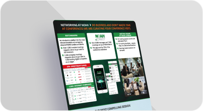 NETWORKING AT NOAH DO BUSINESS AND DON’T WASTE TIME AT CONFERENCES (WE ARE CURATING YOUR CONFERENCE VISIT) MATCHMAKING MEETING ROOMS AT NOAH LONDON An introduction platform for the most 60 meeting spaces on site (one relevant investors and companies Over 9,000 messages and 7,000 dedicated floor) ahead of NOAH London and Berlin: meetings set up at NOAH Berlin 10 meeting locations – easy to Over 1,200 investor meetings The app used by 75% of the find, live and on the floorplan requests about to get sent to conference attendees Meeting rooms bookable on 630 investors demand 2,300 company meetings requests about to get sent to 1,000 leading digital companies at all stages 630+ INVESTMENT FUNDS 1,000+ INTERNET COMPANIES OUR MOST COMPELLING SESSION TRAVIS KALANICK DR. DIETER ZETSCHE Founder CEO 16