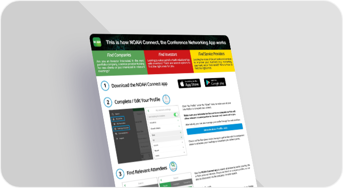 This is how NOAH Connect, the Conference Networking App works Find Companies Find Investors Find Service Providers Are you an investor interested in the next Looking to raise capital or build relationships Looking for state of the art tools and services portfolio company, a service provider looking with investors? There are several options to to improve your business (e.g. marketing, for new clients or just interested in relevant find the right ones for you. payment, work flow tools)? Here is how to meetings? find the right ones. 1 Download the NOAH Connect app 2 Complete / Edit Your Profile Click “My Profile” under the “More” menu to make sure all your information is complete and correct. Make sure your interests for the event are complete as this will allow relevant counterparties to discover and reach out to you. Alternatively, you can also manage your profile through the web interface. Attendee Area / Profile - web Check out the floorplans inside the app to get familiar with the designated areas to schedule your meetings at convenient pre-defined points. 3 Find Relevant Attendees Use the NOAH Connect app to search attendees by sector, country, title or their personal interests. People are listed on company profiles, so can also be discovered via the company / investor search. People Search Click “Search” in the main menu and adjust the search result via “Refine results” 1. Sector – select the industry classification 2. Country – where company is headquartered Alternatively, you can also use the “free text” search. Company / Investor Search Select Companies and adjust the search result via “Refine results” Select Investors and adjust the search result via “Filter / refine your search” 1. Industries – define target investment sectors 2. Active Markets - choose countries which investor is active in 3. Growth Stages – select desired company stage (Seed, VC, Growth, Buyout and Public) Click the company to open the profile page. Identify your point of contact and add to your favorites list, start a conversation or request a meeting. Add to “Favorites” 5