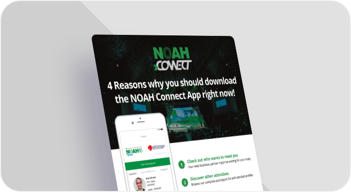 4 Reasons why you should download the NOAH Connect App right now! 1 Check out who wants to meet you Your next business partner might be waiting for your reply 2 Discover other attendees Browse our complete participant list with detailed profiles 3 Connect and chat Start conversations and set up meetings in a few taps 4 Conference program at your fingertips Mark your favourite sessions and build your event agenda Download it now from the App Stores! 4