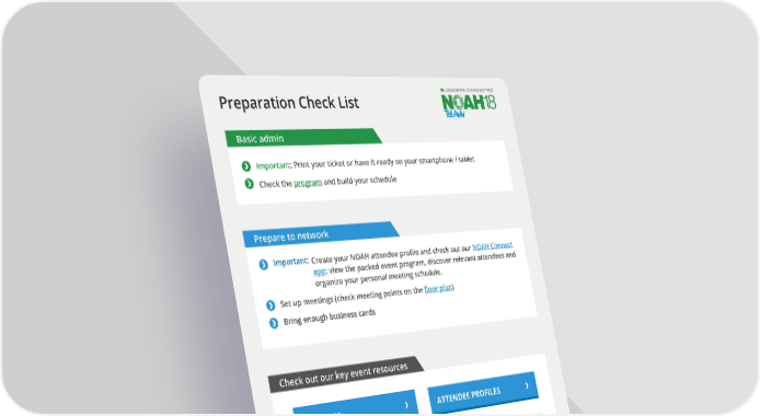 Preparation Check List Basic admin Important: Print your ticket or have it ready on your smartphone / tablet Important: Print your ticket or have it ready on your smartphone / tablet Check the program on our 2 stages and build your schedule Check the program and build your schedule Prepare to network Important: Create your NOAH attendee profile and check out our NOAH Connect app: view the packed event program, discover relevant attendees and organize your personal meeting schedule. Set up meetings (check meeting points on the floor plan) Bring enough business cards Check out our key event resources PROGRAM ATTENDEE PROFILES SPEAKER BOOK INTERNATIONAL GUESTS NOAH CONNECT APP LATEST NOAH NEWSLETTER Social Media Channels Facebook Twitter YouTube Slideshare LinkedIn 7