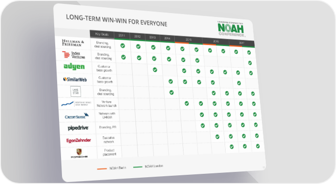 LONG-TERM WIN-WIN FOR EVERYONE Key Goals 2011 2012 2013 2014 2015 2016 2017 Branding, deal sourcing Branding, deal sourcing Customer base growth Customer base growth Branding, deal sourcing Venture Network launch Network with UHNWI Branding, PR Executive network Product placement NOAH Berlin NOAH London 12