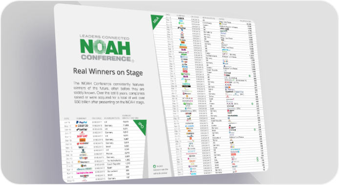 DATE COMPANY ON STAGE HEADQUARTERS BUYER VALUATION ($M) Jun-16 @ NOAH16 US Mega Fund Raise 62.500 A May-11 @ NOAH09 Luxembourg 8.000 & Nov-13 @ NOAH09 Sweden Multiple Mega Fund Raises 5.000 M Nov-15 @ NOAH15 UK 4.780 Ago-15 @ NOAH09 UK 3.667 May-17 @ NOAH16 Netherlands 3.270 Sep-14 @ NOAH16 Germany Various 3.000 May-17 @ NOAH17 Germany Mega Fund Raise 2.800 Ene-14 @ NOAH11 UK 2.800 Oct-15 @ NOAH13 Russia 2.729 Nov-13 @ NOAH16 Germany 2.500 Sep-17 @ NOAH16 UK Mega Fund Raise 2.000 Nov-12 @ NOAH10 US 1.800 Mar-15 @ NOAH09 UK 1.550 Ene-14 @ NOAH10 France (Minority) 1,500+ Dic-14 @ NOAH16 The Netherlands Multiple Fund Raises 1,500+ May-14 @ NOAH16 Germany 1.200 Jun-13 @ NOAH11 US 1.100 ® Dic-12 @ NOAH11 Germany 1.050 Sep-14 @ NOAH09 UK 1.000 Mar-14 @ NOAH13 Sweden Multiple Fund Raises 1.000 Mar-14 @ NOAH12 Czech Republic 1.000 Ene-11 @ NOAH11 France 846 Real Winners on Stage Dic-14 @ NOAH14 US 800 Feb-14 @ NOAH09 UK (Controlling) 800 Oct-13 @ NOAH12 UK (Undisclosed %) 800 Feb-15 @ NOAH15 Germany (51.7%) 706 The NOAH Conference consistently features Ene-15 @ NOAH11 UK 680 May-08 @ NOAH16 Germany 644 winners of the future, often before they are Mar-14 @ NOAH16 Ireland 620 Oct-15 @ NOAH17 UK 617 widely known. Over the last 8 years, companies Abr-11 @ NOAH15 Germany (60%) 600 May-15 @ NOAH14 Turkey 589 raised or were acquired for a total of well over Abr-16 @ NOAH13 Spain 570 $50 billion after presenting on the NOAH stage. Feb-17 @ NOAH16 UK 550 May-12 @ NOAH09 France (50%) 450 Sep-15 @ NOAH16 US 440 Feb-13 @ NOAH09 Spain (30%) 345 Sep-16 (50%) @ NOAH16 Germany 340 CURRENT Ene-11 @ NOAH10 UK 320 DATE COMPANY ON STAGE HEADQUARTERS MARKET CAP ($M) Oct-12 @ NOAH10 Germany 311 May-16 @ NOAH16 Israel 300 Jul-15 @ NOAH17 US 75,679 IPO Jul-12 @ NOAH11 CzechRepublic 250 Sep-14 @ NOAH16 Germany 11,956 Abr-16 @ NOAH15 UK 241 8,276 Ago-15 @ NOAH16 Austria 240 Oct-10 @ NOAH09 UK Jun-15 @ NOAH15 Germany 236 Jun-17 @ NOAH17 Germany 6,813 May-14 @ NOAH12 Israel 228 Abr-14 @ NOAH17 UK 6,072 Mar-15 @ NOAH14 Germany 219 Oct-15 @ NOAH16 Germany 4,367 Oct-14 @ NOAH11 UK 210 Jul-14 @ NOAH16 Switzerland Multiple Fund Raises 200 Oct-14 @ NOAH16 Germany 3,974 May-14 @ NOAH10 Turkey 200 Nov-13 @ NOAH12 Israel 3,020 Abr-17 @ NOAH17 US 200 May-14 @ NOAH17 US 2,743 Oct-14 @ NOAH12 Germany 190 May-16 @ NOAH15 Spain 166 Oct-13 @ NOAH11 France 2,741 Jun-16 @ NOAH16 US 148 Dic-16 @ NOAH12 Germany 2,681 Jun-12 @ NOAH16 UK 134 Sep-16 @ NOAH17 The Netherlands 1,902 Jun-17 @ NOAH16 Germany 120 1,319 Mar-15 @ NOAH16 UK 120 Ene-12 @ NOAH09 Czech Republic Sep-14 @ NOAH12 Italy 100+ Abr-14 @ NOAH13 Spain 324 NOAH Oct-14 @ NOAH10 Spain 100 Abr-14 @ NOAH12 Switzerland 204 Advisors was the Jun-14 @ NOAH13 Israel 100 Jul-14 @ NOAH12 Israel 123 Oct-13 @ NOAH12 Israel 100 sell-side advisor Sep-17 @ NOAH16 Germany 70 May-15 @ NOAH10 Germany 107 Oct-12 @ NOAH11 Germany 50