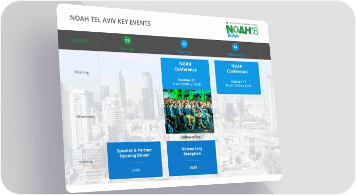 NOAH TEL AVIV KEY EVENTS MARCH 12 13 14 Monday Tuesday Wednesday NOAH NOAH Conference Conference Morning Haoman 17 Haoman 17 From 10:00 to 18:30 From 10:00 to 13:30 Afternoon Followed by: Speaker & Partner Networking Opening Dinner Reception Evening 20:00 18:30 4