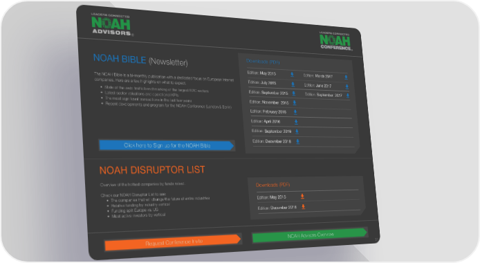 ® ® NOAH BIBLE (Newsletter) Downloads (PDF) Edition: May 2015 Edition: March 2017 The NOAH Bible is a bi-monthly publication with a dedicated focus on European Internet Edition: July 2015 Edition: June 2017 companies. Here are a few highlights on what to expect. • State of the web: traffic benchmarking of the largest B2C sectors Edition: September 2015 Edition: September 2017 • Latest sector valuations and operational KPIs • The most significant transactions in the last few years Edition: November 2015 • Recent developments and program for the NOAH Conference (London & Berlin) Edition: February 2016 Edition: April 2016 Edition: September 2016 Edition: December 2016 Click here to Sign up for the NOAH Bible NOAH DISRUPTOR LIST Overview of the hottest companies by funds raised. Downloads (PDF) Check our NOAH Disruptor List to see: • The companies that will change the future of entire industries Edition: May 2015 • Relative funding by industry vertical • Funding split Europe vs. US Edition: December 2016 • Most active investors by vertical Request Conference Invite NOAH Advisors Overview 21