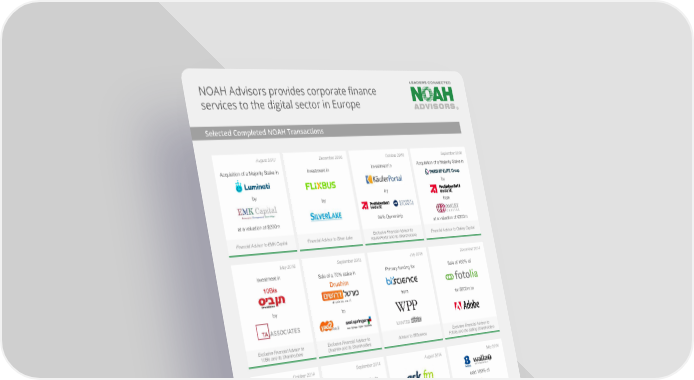 NOAH Advisors provides corporate finance services to the digital sector in Europe Selected Completed NOAH Transactions August 2017 December 2016 October 2016 September 2016 Acquisition of a Majority Stake in Investment in Investment in Acquisition of a Majority Stake in by by by by from at a valuation of $200m 84% Ownership at a valuation of €300m Financial Advisor to EMK Capital Financial Advisor to Silver Lake Exclusive Financial Advisor to Financial Advisor to Oakley Capital KäuferPortal and its Shareholders May 2016 September 2015 July 2015 December 2014 Investment in Sale of a 70% stake in Primary funding for Sale of 100% of 10Bis Drushim from for $800m to by to Exclusive Financial Advisor to Exclusive Financial Advisor to Advisor to BIScience Exclusive Financial Advisor to 10Bis and its Shareholders Drushim and its Shareholders Fotolia and the Selling Shareholders October 2014 September 2014 August 2014 May 2014 Sale of 100% of Sale of controlling stake in sold 100% of for €80m to to sale to for $228m to a joint venture between Exclusive Financial Advisor to Exclusive Financial Advisor to Advisor to the Selling Shareholders Exclusive Financial Advisor to Yad2 Trovit and its Shareholders Facile.it and its Shareholders and its Shareholders February 2013 May 2012 April 2012 December 2011 Sale of 100% in Fund raising for Growth equity investment from $150 million growth equity investment from to for a 30% stake for a 50% stake alongside Fotolia’s from various investors including alongside Softonic’s Founders Founders and TA Associates Angel Investors and Angel Investors at a Additional $150 million senior valuation of €275m debt financing Exclusive Financial Advisor to Financial Advisor to Fotolia and Financial Advisor to Toprural Advisor to Work4 Labs Softonic and its shareholders its Shareholders and its Shareholders 6