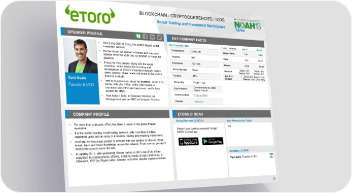 BLOCKCHAIN / CRYPTOCURRENCIES / ICOS Social Trading and Investment Marketplace SPEAKER PROFILE KEY COMPANY FACTS ▪ Yoni is the CEO of eToro, the world’s largest social Key Corporate Facts Traffic Jan-17 Jan-18 investment network Headquarters London, UK Unique Users 1.5m 5.9m ▪ He has shown an interest in finance and computer Founded 2007 Visits 4.9m 30.4m science since his youth and so decided to merge his passions Employees 100-1,000 Minutes 09:08 08:39 ▪ It was this very passion along with the social revolution, which lead to the founding and Active Markets Global Sessions Mobile: 45% Mobile: 40% development of eToro’s investment network, where Desktop: 55% Desktop: 60% Jan 2018 Direct: 52%, Search: 10%, users connect, share, trade and invest in the world’s Funding $73m Sources Referrals: 28%, Other: 10% Yoni Assia financial markets ▪ Yoni is as passionate about his business, as he is for Ownership Private – VCs Founder & CEO family, wife plus 2 kids, which often results in CommerzVentures, Spark excessive use of the word awesome, and hi-fives Key Investors Capital, Ping An around the office ▪ Yoni holds a B.Sc. in Computer Science and NOAH Content eToro at NOAH Management and an MSC in Computer Science Website etoro.com COMPANY PROFILE ETORO @ NOAH Doing Business @ NOAH Main Presentation Topics ▪ For more than a decade, eToro has been a leader in the global Fintech revolution Present your business proposal through N/A ▪ It is the world’s leading social trading network, with more than 6 million NOAH Connect app registered users and an array of innovative trading and investing instruments ▪ At eToro we encourage people to connect with one another to discuss, trade, invest, learn and share knowledge across the network. From now on, you don’t need to be a pro to trade like one ▪ In January 2017, after pioneering Bitcoin trading in 2013 via CFDs, eToro Attendees @ NOAH expanded its cryptocurrency offering, enabling clients to trade and invest in Ethereum, XRP (by Ripple Labs), Litecoin, and other popular cryptocurrencies Yoni Assia, Founder & CEO 35