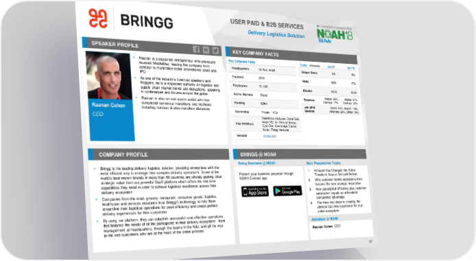 USER PAID & B2B SERVICES Delivery Logistics Solution SPEAKER PROFILE KEY COMPANY FACTS ▪ Raanan is a seasoned entrepreneur who previously Key Corporate Facts Traffic Jan-17 Jan-18 founded MobileMax, leading the company from Headquarters Tel Aviv, Israel Unique Users 43k 40k concept to multimillion-dollar international sales and IPO Founded 2013 Visits 200k 157k ▪ As one of the industry's foremost speakers and Employees 51-100 bloggers, he is a respected authority on logistics and Minutes 02:34 03:24 supply chain market trends and disruptions, speaking in conferences and forums around the globe. Active Markets Global Mobile: 83% Mobile: 67% Sessions Desktop: 17% Desktop: 33% ▪ Raanan is also an avid sports addict who has Funding €25m completed numerous marathons and triathlons Jan 2018 Direct: 54%, Search: 10%, RaananCohen including ironman & ultra-marathon distances Ownership Private – VCs Sources Referrals: 26%, Other: 10% CEO Salesforce Ventures, Coca-Cola, Key Investors Aleph VC, Dr. Shmuel Harlap, Eyal Ofer, Cambridge Capital, Ituran, Pereg Ventures Website bringg.com COMPANY PROFILE BRINGG @ NOAH Doing Business @ NOAH Main Presentation Topics ▪ Bringg is the leading delivery logistics solution, providing enterprises with the most efficient way to manage their complex delivery operations. Some of the Present your business proposal through 1. Amazon Has Changed the Rules: world's best-known brands in more than 50 countries are already gaining clear NOAH Connect app Transform Now or Get Left Behind strategic value from our powerful SaaS platform which offers the real-time 2. Why customer-centric operations have capabilities they need in order to achieve logistical excellence across their become the new strategic imperative delivery ecosystem 3. How operational efficiency plus customer ▪ Companies from the retail, grocery, restaurant, consumer goods, logistics, satisfaction equals an unbeatable healthcare and services industries trust Bringg’s technology to help them competitive advantage streamline their logistical operations for peak efficiency and create perfect 4. The three key steps to creating the delivery experiences for their customers ultimate last mile experience for your ▪ By using our platform, they can establish successful cost-effective operations entire ecosystem that balance the needs of all the participants in their delivery ecosystem - from Attendees @ NOAH management at headquarters, through the teams in the field, and all the way to the end-customers who are at the heart of the entire process Raanan Cohen, CEO 27