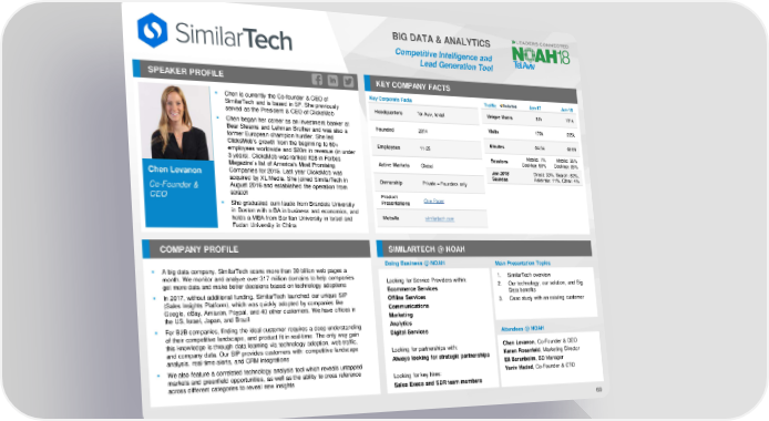 BIG DATA & ANALYTICS Competitive Intelligence and Lead Generation Tool SPEAKER PROFILE KEY COMPANY FACTS ▪ Chen is currently the Co-founder & CEO of Key Corporate Facts Traffic Jan-17 Jan-18 SimilarTech and is based in SF. She previously Headquarters Tel Aviv, Israel Unique Users 81k 101k served as the President & CEO of ClicksMob ▪ Chen began her career as an investment banker at Founded 2014 Visits 179k 225k Bear Stearns and Lehman Brother and was also a former European champion hurdler. She led Minutes 04:54 02:05 ClicksMob’s growth from the beginning to 60+ Employees 11-25 employees worldwide and $20m in revenue (in under Sessions Mobile: 1% Mobile: 35% 3 years). ClicksMob was ranked #28 in Forbes Active Markets Global Desktop: 99% Desktop: 65% Magazine’s list of America’s Most Promising Jan 2018 Direct: 33%, Search: 52%, Chen Levanon Companies for 2015. Last year ClicksMob was Sources Referrals: 11%, Other: 4% acquired by XL Media. She joined SimilarTech in Ownership Private – Founders only Co-Founder & August 2016 and established the operation from CEO scratch Product One Pager ▪ She graduated cum laude from Brandeis University Presentations in Boston with a BA in business and economics, and holds a MBA from Bar Ilan University in Israel and Website similartech.com Fudan University in China COMPANY PROFILE SIMILARTECH @ NOAH Doing Business @ NOAH Main Presentation Topics ▪ A big data company, SimilarTech scans more than 30 billion web pages a month. We monitor and analyze over 317 million domains to help companies Looking for Service Providers within: 1. SimilarTech overview get more data and make better decisions based on technology adoptions Ecommerce Services 2. Our technology, our solution, and Big ▪ In 2017, without additional funding, SimilarTech launched our unique SIP Offline Services Data benefits (Sales Insights Platform), which was quickly adopted by companies like Communications 3. Case study with an existing customer Google, eBay, Amazon, Paypal, and 40 other customers. We have offices in the US, Israel, Japan, and Brazil Marketing ▪ For B2B companies, finding the ideal customer requires a deep understanding Analytics of their competitive landscape, and product fit in real-time. The only way gain Digital Services Attendees @ NOAH this knowledge is through data learning via technology adoption, web traffic, and company data. Our SIP provides customers with: competitive landscape Looking for partnerships with: Chen Levanon, Co-Founder & CEO analysis, real-time alerts, and CRM integrations Always looking for strategic partnerships Keren Rosenfeld, Marketing Director ▪ We also feature a correlated technology analysis tool which reveals untapped Eli Barenboim, BD Manager markets and greenfield opportunities, as well as the ability to cross reference Looking for key hires: Yaniv Hadad, Co-Founder & CTO across different categories to reveal new insights Sales Execs and SDR team members 69