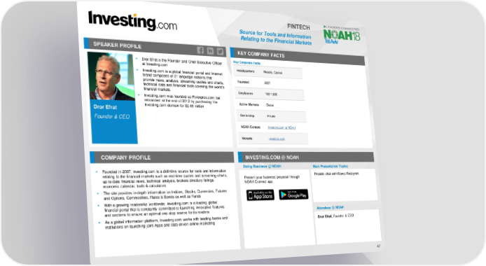 FINTECH Sourcefor Toolsand Information Relating to the Financial Markets SPEAKER PROFILE KEY COMPANY FACTS ▪ Dror Efrat is the Founder and Chief Executive Officer Key Corporate Facts at Investing.com Headquarters Nicosia, Cyprus ▪ Investing.com is a global financial portal and Internet brand composed of 21 language editions that Founded 2007 provide news, analysis, streaming quotes and charts, technical data and financial tools covering the world's financial markets Employees 100-1,000 ▪ Investing.com was founded as Forexpros.com but rebranded at the end of 2012 by purchasing the Active Markets Global Dror Efrat Investing.com domain for $2.45 million Founder & CEO Ownership Private NOAH Content Investing.com at NOAH Website investing.com COMPANY PROFILE INVESTING.COM @ NOAH Doing Business @ NOAH Main Presentation Topics ▪ Founded in 2007, Investing.com is a definitive source for tools and information relating to the financial markets such as real-time quotes and streaming charts, Present your business proposal through Fireside chat with Marco Rodzynek up-to-date financial news, technical analysis, brokers directory listings, NOAH Connect app economic calendar, tools & calculators ▪ The site provides in-depth information on Indices, Stocks, Currencies, Futures and Options, Commodities, Rates & Bonds as well as Funds ▪ With a growing readership worldwide, Investing.com is a leading global financial portal that is constantly committed to launching innovative features and sections to ensure an optimal one-stop source for its readers Attendees @ NOAH ▪ As a global information platform, Investing.com works with leading banks and Dror Efrat, Founder & CEO institutions on launching joint Apps and data-driven online marketing 47