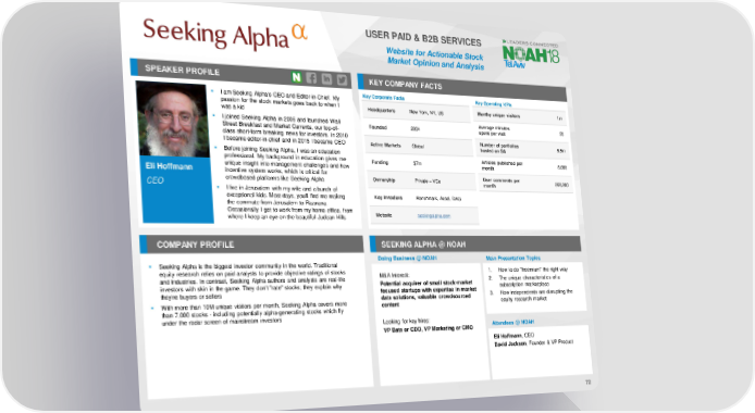USER PAID & B2B SERVICES Website for Actionable Stock Market Opinion and Analysis SPEAKER PROFILE KEY COMPANY FACTS ▪ I am Seeking Alpha's CEO and Editor-in-Chief. My Key Corporate Facts Key Operating KPIs passion for the stock markets goes back to when I Headquarters New York, NY, US Monthy unique visitors 1m was a kid ▪ I joined Seeking Alpha in 2006 and launched Wall Founded 2004 Average minutes 20 Street Breakfast and Market Currents, our top-of- spent per visit class short-form breaking news for investors. In 2010 Number of portfolios I became editor-in-chief and in 2015 I became CEO Active Markets Global hosted on SA 5.5m ▪ Before joining Seeking Alpha, I was an education professional. My background in education gives me Funding $7m Articles published per 8,000 unique insight into management challenges and how month Eli Hoffmann incentive system works, which is critical for User comments per CEO crowdbased platforms like Seeking Alpha Ownership Private – VCs month 300,000 ▪ I live in Jerusalem with my wife and a bunch of exceptional kids. Most days, you'll find me making Key Investors Benchmark, Accel, DAG the commute from Jerusalem to Raanana. Occasionally I get to work from my home-office, from Website seekingalpha.com where I keep an eye on the beautiful Judean Hills COMPANY PROFILE SEEKING ALPHA @ NOAH Doing Business @ NOAH Main Presentation Topics ▪ Seeking Alpha is the biggest investor community in the world. Traditional equity research relies on paid analysts to provide objective ratings of stocks M&A Interest: 1. How to do "freemium" the right way and industries. In contrast, Seeking Alpha authors and analysts are real-life Potential acquirer of small stock-market 2. The unique characteristics of a investors with skin in the game. They don't "rate" stocks; they explain why focused startups with expertise in market subscription marketplace they're buyers or sellers data solutions, valuable crowdsourced 3. How independents are disrupting the ▪ With more than 10M unique visitors per month, Seeking Alpha covers more content equity research market than 7,000 stocks - including potentially alpha-generating stocks which fly under the radar screen of mainstream investors Looking for key hires: VP Data or CDO, VP Marketing or CMO Attendees @ NOAH Eli Hoffmann, CEO David Jackson, Founder & VP Product 72