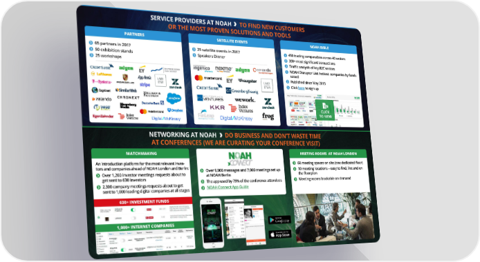 SERVICE PROVIDERS AT NOAH TO FIND NEW CUSTOMERS OR THE MOST PROVEN SOLUTIONS AND TOOLS PARTNERS SATELLITE EVENTS NOAH BIBLE 65 partners in 2017 25 satellite events in 2017 450 trading comparables across 40 sectors 50 exhibition stands Speakers Dinner 300+ most significant transactions 25 workshops Traffic analysis of key B2C sectors NOAH Disruptor List: hottest companies by funds raised Published since May 2015 Click here to sign up CLICK TO VIEW NETWORKING AT NOAH DO BUSINESS AND DON’T WASTE TIME AT CONFERENCES (WE ARE CURATING YOUR CONFERENCE VISIT) MATCHMAKING MEETING ROOMS AT NOAH LONDON An introduction platform for the most relevant inves- 60 meeting spaces on site (one dedicated floor) tors and companies ahead of NOAH London and Berlin: Over 9,000 messages and 7,000 meetings set up 10 meeting locations – easy to find, live and on Over 1,200 investor meetings requests about to at NOAH Berlin the floorplan get sent to 630 investors The app used by 75% of the conference attendees Meeting rooms bookable on demand 2,300 company meetings requests about to get NOAH Connect App Guide sent to 1,000 leading digital companies at all stages 630+ INVESTMENT FUNDS 1,000+ INTERNET COMPANIES
