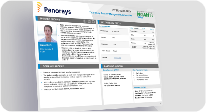 CYBERSECURITY Third Party Security Management Automation SPEAKER PROFILE KEY COMPANY FACTS ▪ Matan brings his entrepreneurial background Key Corporate Facts Traffic Jan-17 Jan-18 addressing untapped markets with his experience in Unique Users N/A <5k building enterprise-focused security solutions. In his Headquarters Tel Aviv, Israel role, he combines his technical background with Visits N/A <5k business leadership and vision ▪ Matan established his first startup at the age of 18, Founded 2016 Minutes N/A 00:08 one of the first local Media & Entertainment sites. He had also co-founded a location-based service for Sessions N/A Mobile: 0% mobile devices and a security startup in the Employees 11-25 Desktop: 100% authentication field. He started Panorays with the Jan 2018 Direct: 19%, Search: 14%, Matan Or-El goal of improving the industry’s cyber-resilience Sources Referrals: 54%, Other: 13% Co-Founder & ▪ Matan served in the Israeli Air Force as chief architect. Later, he worked at Imperva leading the Active Markets Global CEO infrastructure for all of Imperva’s products portfolio. Matan holds a BSc in Computer Science & Bioinformatics and an MBA in entrepreneurship and Website panorays.com innovation. Matan is recognized as one of Israel’s 40 under 40 COMPANY PROFILE PANORAYS @ NOAH Doing Business @ NOAH Main Presentation Topics ▪ Panorays automates third party security management ▪ The platform enables companies to easily view, manage and engage on the Looking for partnerships with: 1. The Problem security posture of their third-parties, vendors, suppliers, and business Telcos, MSSPs, Security Teams, 2. The Current Solution partners Distributors, Integrators, Resellers 3. The Panorays Solution ▪ With the Panorays platform, companies dramatically shorten their third-party 4. The Panorays Value security evaluation process and gain continuous visibility while ensuring Looking for key hires: compliance to regulations such as GDPR and NY DFS VP Sales North America ▪ Panorays is a SaaS-based platform, no installation needed Attendees @ NOAH Matan Or-El, Co-Founder & CEO Demi Ben-Ari, Co-Founder & VP R&D Meir Antar, Co-Founder & COO Noa Bar-Yosef, VP Marketing 62