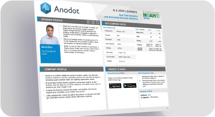 AI & DEEP LEARNING Real Time Analytics and Automated AnomalyDetection SPEAKER PROFILE KEY COMPANY FACTS ▪ David Drai is the CEO and co-founder of Anodot, an Key Corporate Facts Traffic Jan-17 Jan-18 Israeli startup that provides valuable business Headquarters Raanana, Israel Unique Users 15k 69k insights through real time anomaly detection and analytics on Big Data for companies in data-driven Founded 2014 Visits 55k 20k industries such as ad-tech, fintech, e-commerce and mobile Employees 26-50 Minutes 02:50 02:16 ▪ Prior to co-founding Anodot, he served as the CTO of Gett. Before that, he co-founded Cotendo, which Active Markets Global Sessions Mobile: 57% Mobile: 51% was acquired by Akamai for $300 million Desktop: 43% Desktop: 49% ▪ Earlier he was the Chief Architect at Commtouch, a Funding $27.5m Jan 2018 Direct: 41%, Search: 24%, David Drai Nasdaq-traded SaaS cyber company. David holds a Sources Referrals: 22%, Other: 23% Co-Founder & B.Sc. in Computer Science from the Technion – Ownership Private – VCs CEO Israel Institute of Technology Key Investors Redline Capital, Aleph Website anodot.com COMPANY PROFILE ANODOT @ NOAH Doing Business @ NOAH Main Presentation Topics ▪ Anodot is an Artificial Intelligence-powered analytics solution that discovers business incidents in real time, preventing revenue loss and brand damage by Present your business proposal through 1. Disrupting the static nature of today's BI remedying urgent problems faster and capturing opportunities sooner NOAH Connect app with Artificial Intelligence ▪ Its automated machine learning algorithms continuously analyze all your 2. Detecting revenue leaks & new business business data and alert you in real time whenever an incident occurs, even for opportunities in big data can be a major questions you never thought to ask challenge as data-heavy businesses ▪ It detects the business incidents that matter, and identifies why they are grow happening by correlating across multiple data sources ▪ Unlike traditional BI, Anodot has built-in data science, so any user can easily Attendees @ NOAH gain actionable business insights without data science expertise Gil Becker, CEO Ari Applbaum, VP Marketing 17