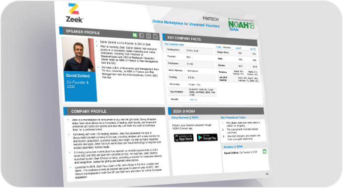 FINTECH Online Marketplace for Unwanted Vouchers SPEAKER PROFILE KEY COMPANY FACTS ▪ Daniel Zelkind is a Co-Founder & CEO of Zeek Key Corporate Facts Traffic Jan-17 Jan-18 ▪ Prior to founding Zeek, Daniel Zelkind held executive Headquarters Tel Aviv, Israel Unique Users 161k 194k positions in successful digital marketing and media companies, including Vice President at Founded 2014 Visits 325k 469k MassiveImpact and CEO at Mediacom Interaction. Daniel holds an MBA in Finance & Risk Management Employees 51-100 Minutes 02:01 02:43 from the IDC ▪ He holds a B.A. in Economics and Management from Active Markets International Sessions Mobile: 56% Mobile: 51% Tel Aviv University, an MBA in Finance and Risk Desktop: 44% Desktop: 49% Management from the Interdisciplinary Center (IDC) Funding $12.5m Jan 2018 Direct: 49%, Search: 28%, Daniel Zelkind Herzliya Sources Referrals: 7%, Other: 16% Co-Founder & Ownership Private – VCs CEO Qualcomm, Scale Up, Target Key Investors Global, Blumberg Capital, Viola Credit Website zeek.me COMPANY PROFILE ZEEK @ NOAH ▪ Zeek is a marketplace for consumers to buy and sell gift cards. Savvy shoppers Doing Business @ NOAH Main Presentation Topics enjoy face value discounts on hundreds of leading retail brands, and those with 1. Why plastic (debit and credit cards) is unwanted gift cards can quickly and securely turn them into cash or exchange Present your business proposal through rubbish for shopping them for a preferred brand. NOAH Connect app 2. The quiet growth of retailer backed ▪ Partnering with over 100 leading retailers, Zeek has pioneered the sale of currencies discounted branded currency in Europe, providing retailers with a new solution for 3. How both shoppers and retailers win distribution, acquisition, customer loyalty and insight. As well as highly regarded from a pre-paid relationship website and apps, Zeek has built world class anti-fraud technology to regulate and protect secondary market resale. ▪ A thriving consumer marketplace has opened up multiple opportunities to build Attendees @ NOAH more B2C and B2B pre-payment solutions on-top. For example, Zeek recently launched its own Zeek Choice currency, providing a solution for corporate rewards Daniel Zelkind, Co-Founder & CEO and recognition, consumer gifting and earned value payout. ▪ Launched in 2015, Zeek has a team of 60, with offices in Tel Aviv, London and Berlin. The business is venture-backed and grew 3x year-on-year in 2017, with vibrant marketplaces in both the UK and Germany and plans for further European expansion 95