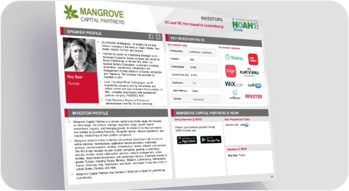 INVESTORS VC and PE firm based in Luxembourg SPEAKER PROFILE KEY INVESTORFACTS Key Corporate Facts Key Portfolio Companies ▪ As a Partner at Mangrove, I’m looking for our next Unicorn company in the fields of: SaaS, Mobile, New Headquarters Luxembourg, Luxembourg media, Adtech, FinTech and Security ▪ I started my career as a Marketing Manager for an Founded 2000 American Consumer Goods company and moved to focus in technology in the late 90s, when I co- founded Sphera Corporation, a company providing Funds Raised $750m automation, provisioning, virtualization and management of Saas solutions to hosting companies Current Fund Size $170m and Telecoms. The company was acquired by Roy Saar Parallels in 2007 Partner ▪ Later, I founded RFcell Technologies, an RF Employees 1-10 engineering company serving the wireless and cellular market and was involved in the foundation of Active Markets Global Wix–a leading cloud-based web development platform company (NADSAQ: WIX) Website ▪ I hold Bachelor's Degree in Economy & mangrove.vc Administration from the Tel Aviv University INVESTORPROFILE MANGROVE CAPITAL PARTNERS @ NOAH ▪ Mangrove Capital Partners is a venture capital and private equity firm focused Doing Business @ NOAH Main Presentation Topics on early-stage, mid venture, startups, expansion stage, growth capital Interview with investments, buyouts, and emerging growth. Its mission is to help turn visions Present your business proposal through into realities by providing financing, thoughtful advice, relevant experience, and NOAH Connect app industry relationships to their portfolio companies. ▪ Mangrove seeks to invest in internet and software businesses with a focus on online services, marketplaces, application service providers, multimedia services, communications, wireless, infrastructure, media, network, and services. The firm is also focused on peer-to-peer computing, gaming, e-commerce, security, mobile, mobile value-added services, network management, urban Attendees @ NOAH mobility, SaaS-based businesses, and automotive industry. It primarily invests in greater Europe, including Russia, Benelux, Belgium, Luxembourg, Netherlands, Roy Saar, Partner France, Germany, Italy, Switzerland, and Spain, and Israel. It may also invest in United States, Canada, and India. ▪ Mangrove Capital Partners was founded in 2000 and is based in Luxembourg, Luxembourg. 54