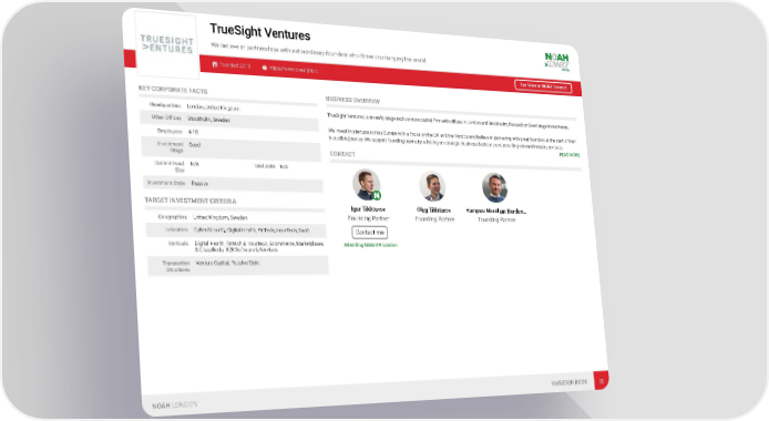 TrueSight Ventures We believe in partnerships with extraordinary founders who thrive on changing the world Founded: 2019 https://www.truesight.vc See More at NOAH Connect KEY CORPORATE FACTS BUSINESS OVERVIEW Headquarters London, United Kingdom TrueSight Ventures is an early stage tech venture capital firm with offices in London and Stockholm, focused on Seed stage investments. Other Offices Stockholm, Sweden We invest in startups across Europe with a focus on the UK and the Nordics and believe in partnering with great founders at the start of their Employees 4-10 incredible journey. We support founding teams by advising on strategic business decisions and providing relevant industry contacts. READ MORE Investment Seed CONTACT Stage Current Fund N/A Total AUM N/A Size Investment Style Passive TARGET INVESTMENT CRITERIA Igor Tikhturov Oleg Tikhturov Hampus Monthan Norden… Geographies United Kingdom, Sweden Founding Partner Founding Partner Founding Partner Industries Cyber Security, Digital Health, FinTech, InsurTech, SaaS Contact me Verticals Digital Health, Fintech & Insurtech, Ecommerce, Marketplaces Attending NOAH19 London & Classifieds, B2B Software & Services Transaction Venture Capital, Passive Style Structures NOAH LONDON INVESTOR BOOK 58