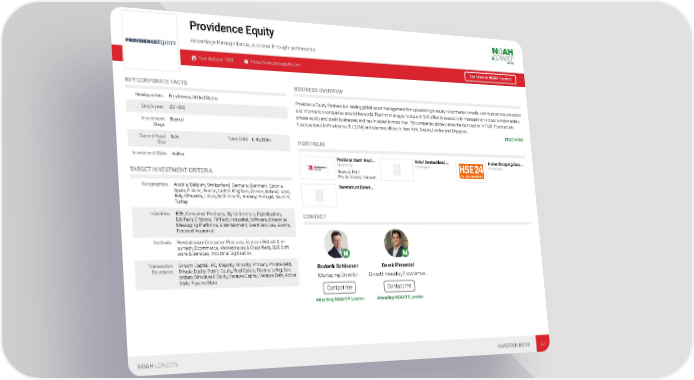 Providence Equity Advantage through focus, success through partnership Founded: pre-1990 https://www.provequity.com See More at NOAH Connect KEY CORPORATE FACTS BUSINESS OVERVIEW Headquarters Providence, United States Providence Equity Partners is a leading global asset management firm specializing in equity investments in media, communications, education and information companies around the world. The firm manages funds with $45 billion in assets under management across complementary Employees 251-500 private equity and credit businesses and has invested in more than 150 companies globally since the its inception in 1989. Providence is Investment Buyout headquartered in Providence, R.I. (USA) and also has offices in New York, Boston, London and Singapore. Stage READ MORE Current Fund N/A Total AUM € 45,000m PORTFOLIO Size Investment Style Active ProSiebenSat1 Medi… Kabel Deutschland … Home Shopping Euro… Germany Germany Germany News & Print TARGET INVESTMENT CRITERIA Revolutionary Consum… Geographies Austria, Belgium, Switzerland, Germany, Denmark, Estonia, Superstruct Entert… Spain, Finland, France, United Kingdom, Greece, Ireland, Israel, Italy, Lithuania, Latvia, Netherlands, Norway, Portugal, Sweden, Turkey Industries B2B, Consumer Products, Digital Services, Digitalisation, CONTACT EduTech, E-Sports, FinTech, Industrial, Software, Enterprise Messaging Platforms, Entertainment, Event Services, Events, Personal Insurance Verticals Revolutionary Consumer Products, Edutech, Fintech & In- surtech, Ecommerce, Marketplaces & Classifieds, B2B Soft- ware & Services, Industrial Digitisation Transaction Growth Capital, IPO, Majority, Minority, Primary, Private Debt, Roderik Schlosser Derek Pimentel Structures Private Equity, Public Equity, Real Estate, Restructuring, Sec- ondary, Structured Equity, Venture Capital, Venture Debt, Active Managing Director Growth Investor, Providence… Style, Passive Style Contact me Contact me Attending NOAH19 London Attending NOAH19 London NOAH LONDON INVESTOR BOOK 44