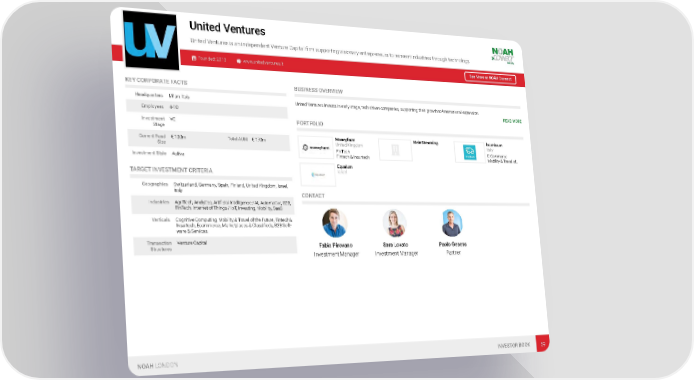 United Ventures United Ventures is an independent Venture Capital firm supporting visionary entrepreneurs to reinvent industries through technology. Founded: 2013 www.unitedventures.it See More at NOAH Connect KEY CORPORATE FACTS BUSINESS OVERVIEW Headquarters Milan, Italy United Ventures invests in early-stage, tech driven companies, supporting their growth to international expansion. READ MORE Employees 4-10 PORTFOLIO Investment VC Stage Moneyfarm MainStreaming brumbrum Current Fund € 100m Total AUM € 170m United Kingdom Italy Size FinTech E-Commerce Fintech & Insurtech Mobility & Travel of… Investment Style Active Equalum Israel TARGET INVESTMENT CRITERIA Geographies Switzerland, Germany, Spain, Finland, United Kingdom, Israel, Italy CONTACT Industries AgriTech, Analytics, Artificial Intelligence / AI, Automotive, B2B, FinTech, Internet of Things / IoT, Investing, Mobility, SaaS Verticals Cognitive Computing, Mobility & Travel of the Future, Fintech & Insurtech, Ecommerce, Marketplaces & Classifieds, B2B Soft- ware & Services Transaction Venture Capital Fabio Pirovano Sara Lovato Paolo Gesess Structures Investment Manager Investment Manager Partner NOAH LONDON INVESTOR BOOK 59