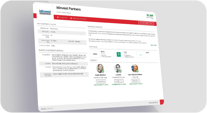 Idinvest Partners Financing the future Founded: 1997 https://www.idinvest.com/ See More at NOAH Connect KEY CORPORATE FACTS BUSINESS OVERVIEW Headquarters Paris, France Idinvest Partners is a reputed pan-European mid-market private equity and venture capital firm. With more than EUR 8 bln u.m. (part of Eurazeo, a group with EUR 17 bn u.m.), the firm has developed several areas of expertise including venture capital transactions (more than EUR 2.7 bn Employees 101-250 u.m.). Investment VC Stage Our Venture Capital practice has participated for more than 20 years in great success stories in IT in Europe: B2C: Withings, Happn, Deezer, Zenly, Vestiaire Collective, Secret Escapes, Meetic, Winamax, Webedia, Frichti, Molotov etc. Current Fund € 1,000m Total AUM € 8,000m READ MORE Size Investment Style Active PORTFOLIO TARGET INVESTMENT CRITERIA WeFox Glovo Adjust Germany Spain Insurance E-Commerce Geographies Austria, Belgium, Switzerland, Czech Republic, Germany, Den- Fintech & Insurtech Mobility & Travel of… mark, Estonia, Spain, Finland, France, United Kingdom, Greece, Ireland, Israel, Italy, Lithuania, Latvia, Netherlands, Norway, Poland, Portugal, Russia, Sweden, Turkey CONTACT Industries Electro-Mobility, Mobility, Personal Insurance Verticals Revolutionary Consumer Products, Digital Health, Mobility & Travel of the Future, Edutech, Fintech & Insurtech, B2B Soft- ware & Services, Industrial Digitisation Transaction Growth Capital, Minority, Venture Capital, Active Style Structures Sophie Bruchou Louis Bô Anne Charlotte Philbert Investment Manager Investment Manager Associate Contact me Contact me Contact me Attending NOAH19 London Attending NOAH19 London Attending NOAH19 London NOAH LONDON INVESTOR BOOK 29