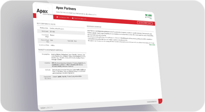 Apax Partners Apax Partners is a leading global private equity advisory firm. Founded: pre-1990 https://www.apax.com/ See More at NOAH Connect KEY CORPORATE FACTS BUSINESS OVERVIEW Headquarters London, United Kingdom Apax Partners is an independent global partnership focused solely on long-term investment in growth companies. Funds advised by Apax Partners typically invest in large companies with an enterprise value between €1bn and €5bn. The Funds invest in four sectors: Tech & Telco, Employees 251-500 Services, Healthcare, and Consumer. Investment Buyout Releasing potential is at the heart of everything we do. Whether it’s identifying potential investments, growing our portfolio companies or Stage realising their value at the right time, our strategy is geared to releasing potential. Throughout over 30 years since the raising of the first fund, the company has successfully invested across all investment stages, and through… Current Fund N/A Total AUM N/A READ MORE Size Investment Style Active TARGET INVESTMENT CRITERIA Geographies Austria, Belgium, Switzerland, Czech Republic, Germany, Den- mark, Estonia, Spain, Finland, France, United Kingdom, Greece, Ireland, Italy, Lithuania, Latvia, Netherlands, Norway, Poland, Portugal, Sweden Industries B2B, Business Insurance, Consumer Products, Digital Health, Digitalisation, EduTech, FinTech, Industrial, B2B Service Provider, Mobility, Personal Insurance Verticals Revolutionary Consumer Products, Digital Health, Mobility & Travel of the Future, Edutech, Fintech & Insurtech, B2B Soft- ware & Services, Industrial Digitisation Transaction Growth Capital, Majority, Private Equity, Active Style Structures NOAH LONDON INVESTOR BOOK 2