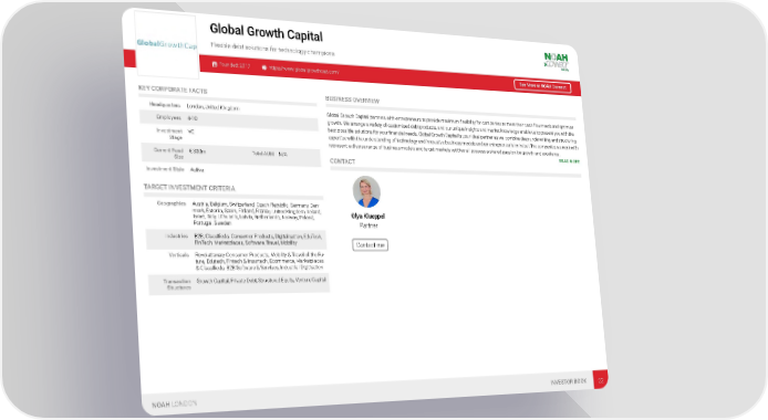 Global Growth Capital Flexible debt solutions for technology champions Founded: 2017 https://www.globalgrowthcap.com/ See More at NOAH Connect KEY CORPORATE FACTS BUSINESS OVERVIEW Headquarters London, United Kingdom Global Growth Capital partners with entrepreneurs to provide maximum flexibility for companies to meet their cash flow needs and optimise growth. We arrange a variety of customised debt products, and our unique insights and market knowledge enable us to present you with the Employees 4-10 best possible solutions for your financial needs. Global Growth Capital is your ideal partner as we combine deep underwriting and structuring Investment VC expertise with the understanding of technology and innovative business models and an entrepreneurial mindset.The companies we work with Stage represent a diverse range of business models and target markets yet they all possess a shared passion for growth and excellence. READ MORE Current Fund € 300m Total AUM N/A Size CONTACT Investment Style Active TARGET INVESTMENT CRITERIA Geographies Austria, Belgium, Switzerland, Czech Republic, Germany, Den- mark, Estonia, Spain, Finland, France, United Kingdom, Ireland, Olya Klueppel Israel, Italy, Lithuania, Latvia, Netherlands, Norway, Poland, Portugal, Sweden Partner Industries B2B, Classifieds, Consumer Products, Digitalisation, EduTech, FinTech, Marketplaces, Software, Travel, Mobility Contact me Verticals Revolutionary Consumer Products, Mobility & Travel of the Fu- ture, Edutech, Fintech & Insurtech, Ecommerce, Marketplaces & Classifieds, B2B Software & Services, Industrial Digitisation Transaction Growth Capital, Private Debt, Structured Equity, Venture Capital Structures NOAH LONDON INVESTOR BOOK 22