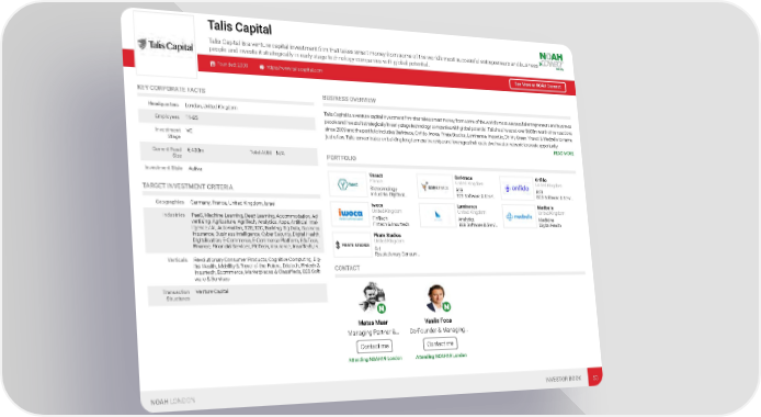 Talis Capital Talis Capital is a venture capital investment firm that takes smart money from some of the world’s most successful entrepreneurs and business people and invests it strategically in early stage technology companies with global potential. Founded: 2009 https://www.taliscapital.com See More at NOAH Connect KEY CORPORATE FACTS BUSINESS OVERVIEW Headquarters London, United Kingdom Talis Capital is a venture capital investment firm that takes smart money from some of the world’s most successful entrepreneurs and business people and invests it strategically in early stage technology companies with global potential. Talis has invested over $600m worth of transactions Employees 11-25 since 2009 and the portfolio includes Darktrace, Onfido, iwoca, Pirate Studios, Luminance, import.io, Oh My Green, Ynsect & Medbelle to name Investment VC just a few. Talis concentrates on building long term partnerships and leverages their exclusive investor network to create opportunity Stage READ MORE Current Fund € 400m Total AUM N/A PORTFOLIO Size Investment Style Active Ynsect Darktrace Onfido France United Kingdom United Kingdom Biotechnology B2B B2B TARGET INVESTMENT CRITERIA Industrial Digitisat… B2B Software & Servi… B2B Software & Servi… Geographies Germany, France, United Kingdom, Israel iwoca Luminance Medbelle United Kingdom United Kingdom United Kingdom Industries PaaS, Machine Learning, Deep Learning, Accommodation, Ad- FinTech Analytics Medicine vertising, Agriculture, AgriTech, Analytics, Apps, Artificial Intel- Fintech & Insurtech B2B Software & Servi… Digital Health ligence / AI, Automation, B2B, B2C, Banking, Big Data, Business Insurance, Business Intelligence, Cyber Security, Digital Health, Pirate Studios Digitalisation, E-Commerce, E-Commerce Platform, EduTech, United Kingdom Finance, Financial Services, FinTech, Insurance, InsurTech, In… Art Revolutionary Consum… Verticals Revolutionary Consumer Products, Cognitive Computing, Dig- ital Health, Mobility & Travel of the Future, Edutech, Fintech & CONTACT Insurtech, Ecommerce, Marketplaces & Classifieds, B2B Soft- ware & Services Transaction Venture Capital Structures Matus Maar Vasile Foca Managing Partner &… Co-Founder & Managing… Contact me Contact me Attending NOAH19 London Attending NOAH19 London NOAH LONDON INVESTOR BOOK 53