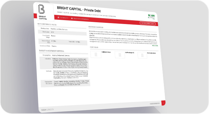 BRIGHT CAPITAL - Private Debt BRIGHT CAPITAL is a leading investor focussing on small and medium-sized enterprises. Founded: 2014 https://www.brightcapital.de See More at NOAH Connect KEY CORPORATE FACTS BUSINESS OVERVIEW Headquarters Frankfurt am Main, Germany We provide one-stop capital to SMEs, which we believe are underserved by traditional lenders, across a wide range of industries. As part of our strategy we are able to invest up and down a company’s capital structure in situations where bespoke financing solutions generate substantial Employees 4-10 value-add. Investment Buyout Bright Capital’s investment strategy relies on deep engineering experience, comprehensive due diligence and passive but profound portfolio Stage management. We are able to provide individual and tailored financing solutions and offer enhanced execution certainty to both sponsors and management teams, further supported by a lean and timely investment process. Typically, we either lead the transactions in which we invest… Current Fund € 100m Total AUM € 100m READ MORE Size Investment Style Passive PORTFOLIO TARGET INVESTMENT CRITERIA Krallmann Group Wolfensberger AG Rent to Buy Music Geographies Austria, Switzerland, Germany Industries Publisher, Biotechnology, PaaS, Engineering, Machine Learn- ing, Deep Learning, Semiconductors, Human Resources, Ac- commodation, Software, Travel, Travel Channel Manager, B2B Service Provider, Mobility, Performance, Personal Online Edu- cation, Printed Goods, Private Accommodation, Private Avia- tion, Restaurants & Bars, Retail, Rights Management, Search,… Verticals Revolutionary Consumer Products, Cognitive Computing, Dig- ital Health, Mobility & Travel of the Future, Edutech, Fintech & Insurtech, Ecommerce, Marketplaces & Classifieds, B2B Soft- ware & Services, Blockchain-Powered Businesses, Industrial Digitisation, Consumer Software & Services Transaction Growth Capital, Majority, Mezzanine, Minority, Primary, Private Structures Debt, Private Equity, Public Equity, Restructuring, Secondary, Structured Equity, Venture Debt, Passive Style NOAH LONDON INVESTOR BOOK 7