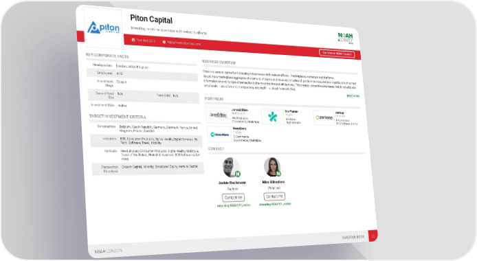 Piton Capital Investing in online business with network effects Founded: 2010 https://www.pitoncap.com/ See More at NOAH Connect KEY CORPORATE FACTS BUSINESS OVERVIEW Headquarters London, United Kingdom Piton is a venture capital fund investing in businesses with network effects – marketplaces, exchanges and platforms. At volume a marketplace aggregates the demand of buyers and the supply of sellers of goods or services, and also organizes the important Employees 4-10 information around its type of transaction in the most intuitive and efficient way. This creates competitive advantages that do not exist at a Investment Growth small scale – selection, price transparency, and depth – a classic network effect. Stage READ MORE Current Fund N/A Total AUM N/A PORTFOLIO Size Investment Style Active JamesEdition DocPlanner zenloop Netherlands Poland Germany Marketplaces Medicine E-Commerce TARGET INVESTMENT CRITERIA Ecommerce, Marketpla… Digital Health B2B Software & Servi… Geographies Belgium, Czech Republic, Germany, Denmark, France, United ManoMano Kingdom, Poland, Sweden France E-Commerce Industries B2B, Consumer Products, Digital Health, Digital Services, Fin- Ecommerce, Marketpla… Tech, Software, Travel, Mobility CONTACT Verticals Revolutionary Consumer Products, Digital Health, Mobility & Travel of the Future, Fintech & Insurtech, B2B Software & Ser- vices Transaction Growth Capital, Minority, Structured Equity, Venture Capital Structures Andrin Bachmann Mira Mihaylova Partner Principal Contact me Contact me Attending NOAH19 London Attending NOAH19 London NOAH LONDON INVESTOR BOOK 43