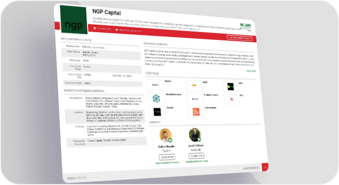NGP Capital A global venture capital firm with over $1.2B under management, investing in growth-stage tech companies within the Intelligent Enterprise, Smart Mobility, and Digital Health. We are active in the U.S., Europe, India, and China. Visit us at ngpcap.com. Founded: 2005 https://www.ngpcap.com/ See More at NOAH Connect KEY CORPORATE FACTS BUSINESS OVERVIEW Headquarters Palo Alto, United States NGP Capital is a global venture capital firm with over $1.2 billion under management, investing in growth-stage technology companies within the Intelligent Enterprise, Smart Mobility, and Digital Health markets. We back entrepreneurs who share our Connected World vision – a vision Other Offices Helsinki, Finland where the confluence of sensors, mobility, software, and cloud solutions will connect people, things and industries in new ways, transforming Beijing, China how we live and work. NGP Capital is active in the U.S., Europe, India, and China. Visit us at www.ngpcap.com and follow us on LinkedIn and Employees 26-50 Twitter (@ngpcapital). READ MORE Investment Growth Stage PORTFOLIO Current Fund € 350m Total AUM € 1,200m Size Moovit Egym Lime Investment Style Active TARGET INVESTMENT CRITERIA SecurityScorecard AI Squirrel Learni… Clue Geographies Austria, Belgium, Switzerland, Czech Republic, Germany, Den- mark, Estonia, Spain, Finland, France, United Kingdom, Greece, Ireland, Israel, Italy, Lithuania, Latvia, Netherlands, Norway, Poland, Portugal, Sweden, Turkey Scandit GetYourGuide Industries Engineering, Machine Learning, Deep Learning, Analytics, Au- tomotive, Big Data, Cyber Security, Data Science, Digital Health, Electro-Mobility, Mobility, SaaS, Data Management Platforms, Enterprise Hardware, Enterprise Information Management CONTACT Verticals Cognitive Computing, Digital Health, Mobility & Travel of the Future, Ecommerce, Marketplaces & Classifieds, B2B Software & Services, Blockchain-Powered Businesses, Industrial Digiti- sation Transaction Growth Capital, Minority, Venture Capital Structures Walter Masalin Jacob Fellman Partner Associate Contact me Contact me Attending NOAH19 London Attending NOAH19 London NOAH LONDON INVESTOR BOOK 39