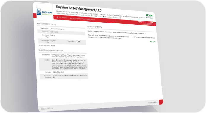 Bayview Asset Management, LLC Bayview is a leading investment firm, focused mortgage credit, mortgage-backed securities, mortgage backed securities and other mortgage-re- lated assets. We are now also looking at private equity (in particular fintech, lending and real estate). Founded: 1993 http://www.bayviewassetmanagement.com See More at NOAH Connect KEY CORPORATE FACTS BUSINESS OVERVIEW Headquarters London, United Kingdom Bayview is a mortgage and credit focused asset management firm active in the US as well as Europe with $14bn in AUMs. Employees 1,001-10,000 We are building our European activites and look to invest in fintech and finance (debt and equity) financial services and real estate businesses Investment Growth (equity, structured equity, mezzanine, debt) in the European market. Stage READ MORE Current Fund € 2,500m Total AUM € 14,000m Size Investment Style Active TARGET INVESTMENT CRITERIA Geographies Germany, Denmark, Spain, Finland, France, United Kingdom, Greece, Ireland, Israel, Italy, Netherlands, Portugal, Sweden Industries Asset Management, Bank Accounts, Banking, Business Cred- it Services, Business Information Services, Business Insur- ance, Buyout / Private Equity, Buyout Debt, Credit Analy- sis, Credit Services, Debt Capital Markets, Finance, Financial Products, Financial Services, FinTech, Hedge Fund, Payments, Peer-to-Peer Lending, Travel Channel Manager, Corporate Fi… Verticals Fintech & Insurtech Transaction Growth Capital, Majority, Minority, Private Debt, Structured Eq- Structures uity NOAH LONDON INVESTOR BOOK 5