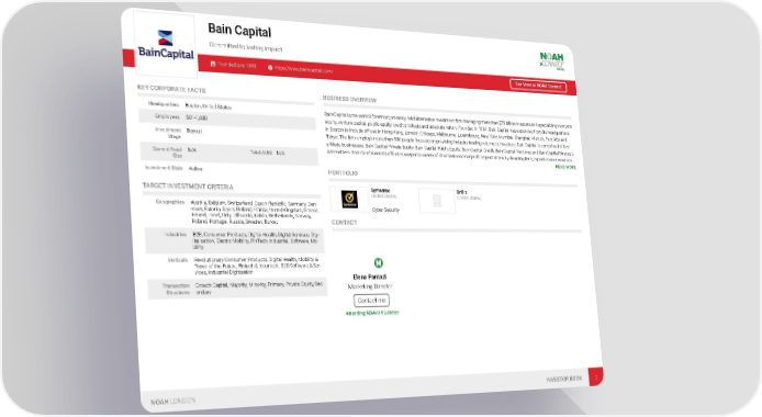 Bain Capital Committed to lasting impact Founded: pre-1990 https://www.baincapital.com/ See More at NOAH Connect KEY CORPORATE FACTS BUSINESS OVERVIEW Headquarters Boston, United States Bain Capital is the world’s foremost, privately-held alternative investment firm managing more than $75 billion in assets and specializing in private equity, venture capital, public equity, credit products and absolute return. Founded in 1984, Bain Capital has expanded from its headquarters Employees 501-1,000 in Boston to include offices in Hong Kong, London, Chicago, Melbourne, Luxembourg, New York, Mumbai, Shanghai, Munich, Palo Alto and Investment Buyout Tokyo. The firm employs more than 900 people focused on providing industry-leading returns to investors. Bain Capital is comprised of five Stage affiliate businesses: Bain Capital Private Equity, Bain Capital Public Equity, Bain Capital Credit, Bain Capital Ventures and Bain Capital Strategic Alternatives. Bain Capital and its affiliates support a variety of charitable and nonprofit organizations by donating time, expertise and resources.… Current Fund N/A Total AUM N/A READ MORE Size Investment Style Active PORTFOLIO TARGET INVESTMENT CRITERIA Symantec Brillio United States United States Geographies Austria, Belgium, Switzerland, Czech Republic, Germany, Den- Cyber Security mark, Estonia, Spain, Finland, France, United Kingdom, Greece, Ireland, Israel, Italy, Lithuania, Latvia, Netherlands, Norway, Poland, Portugal, Russia, Sweden, Turkey CONTACT Industries B2B, Consumer Products, Digital Health, Digital Services, Dig- italisation, Electro-Mobility, FinTech, Industrial, Software, Mo- bility Verticals Revolutionary Consumer Products, Digital Health, Mobility & Travel of the Future, Fintech & Insurtech, B2B Software & Ser- vices, Industrial Digitisation Elena Pantazi Transaction Growth Capital, Majority, Minority, Primary, Private Equity, Sec- Marketing Director Structures ondary Contact me Attending NOAH19 London NOAH LONDON INVESTOR BOOK 3