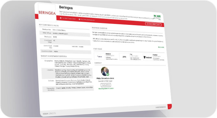 Beringea Beringea is a transatlantic venture capital investor managing almost $500m in funds and more than 60 portfolio companies across the U.K., Europe and North America. We invest up to $10m in Series A or Series B rounds of fast growing companies. Founded: Please Select http://www.beringea.com See More at NOAH Connect KEY CORPORATE FACTS BUSINESS OVERVIEW Headquarters Detroit, United States Beringea is a transatlantic venture capital investor that seeks to create lasting success for rapidly scaling entrepreneurial companies. It currently manages almost $500m in funds and more than 60 portfolio companies across the U.K., Europe and North America. Other Offices London, United Kingdom Employees 26-50 With offices London, Manchester and Detroit (U.S.), it provides patient capital and a global footprint to back founders throughout their journey, helping them overcome barriers to scale and build international success stories. Investment VC Stage READ MORE Current Fund € 500m Total AUM € 500m Size PORTFOLIO Investment Style Active Aistemos Poq Festicket United Kingdom United Kingdom United Kingdom TARGET INVESTMENT CRITERIA Software App Development E-Commerce B2B Software & Servi… B2B Software & Servi… Ecommerce, Marketpla… Geographies Austria, Belgium, Switzerland, Czech Republic, Germany, Den- mark, Estonia, Spain, Finland, France, United Kingdom, Greece, CONTACT Ireland, Israel, Italy, Lithuania, Latvia, Netherlands, Norway, Poland, Portugal, Russia, Sweden, Turkey Industries Machine Learning, Deep Learning, Artificial Intelligence / AI, Augmented Reality, Automation, B2B, B2C, Business Intel- ligence, Casual Gaming, E-Sports, FinTech, Gaming, Gam- ing Platforms, InsurTech, Mobile Commerce, Mobile Gaming, PropTech, Social Gaming, Software, Virtual Reality, SaaS Philip Edmondson-Jones Verticals Revolutionary Consumer Products, Digital Health, Edutech, Investment Manager Fintech & Insurtech, Ecommerce, Marketplaces & Classifieds, B2B Software & Services, Industrial Digitisation Contact me Transaction Growth Capital, Minority, Primary, Venture Capital, Active Style Structures Attending NOAH19 London NOAH LONDON INVESTOR BOOK 6
