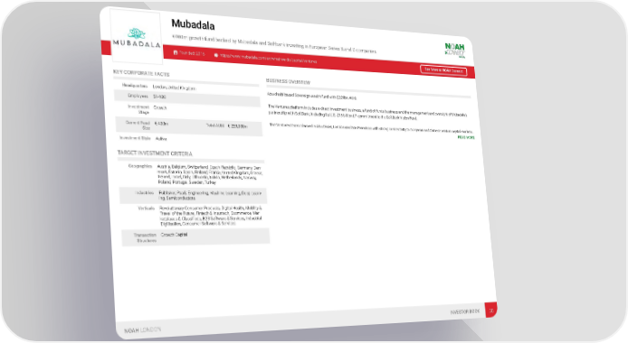 Mubadala €400m growth fund backed by Mubadala and Softbank investing in European Series B and C companies. Founded: 2016 https://www.mubadala.com/en/what-we-do/capital/ventures See More at NOAH Connect KEY CORPORATE FACTS BUSINESS OVERVIEW Headquarters London, United Kingdom Abu-dhabi based Sovereign wealth fund with $229bn AUM. Employees 51-100 The Ventures platform includes a direct investment business, a fund of funds business and the management and oversight of Mubadala’s Investment Growth partnership with SoftBank, including its U.S. $15 billion LP commitment to the SoftBank Vision Fund. Stage The Ventures team is based in Abu Dhabi, London and San Francisco with strong connectivity to European and Chinese venture capital markets… Current Fund € 400m Total AUM € 229,000m READ MORE Size Investment Style Active TARGET INVESTMENT CRITERIA Geographies Austria, Belgium, Switzerland, Czech Republic, Germany, Den- mark, Estonia, Spain, Finland, France, United Kingdom, Greece, Ireland, Israel, Italy, Lithuania, Latvia, Netherlands, Norway, Poland, Portugal, Sweden, Turkey Industries Publisher, PaaS, Engineering, Machine Learning, Deep Learn- ing, Semiconductors Verticals Revolutionary Consumer Products, Digital Health, Mobility & Travel of the Future, Fintech & Insurtech, Ecommerce, Mar- ketplaces & Classifieds, B2B Software & Services, Industrial Digitisation, Consumer Software & Services Transaction Growth Capital Structures NOAH LONDON INVESTOR BOOK 38