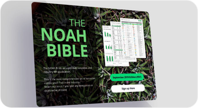 The NOAH Bible, an up-to-date valuation and industry KPI publication. This is the most comprehensive set of valuation September 2019 Edition (PDF) comps you’ll find in the industry. Reach out to us if you spot any companies or deals we’ve missed! Sign up Here