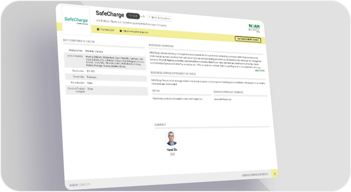 FinTech + 5 Fintech & Insurtech SafeCharge A full-stack, flexible, innovative payment technology company. Founded: 2007 http://www.safecharge.com See More at NOAH Connect KEY CORPORATE FACTS BUSINESS OVERVIEW SafeCharge, a Nuvei company, is the payment service partner for the world’s most demanding businesses. SafeCharge provides global Headquarters Montréal, Canada omni-channel payment solutions from card acquiring to payment processing and checkout, all underpinned by advanced risk management Active Markets Austria, Belgium, Switzerland, Czech Republic, Germany, Den- solutions. This fully-featured proprietary payment platform connects directly to all major payment card schemes including Visa, Master- mark, Estonia, Spain, Finland, France, United Kingdom, Greece, card, American Express and UnionPay, as well as over 150 local payment methods. SafeCharge brings best in class payment technology,… Ireland, Israel, Italy, Lithuania, Latvia, Netherlands, Norway, READ MORE Poland, Portugal, Russia, Sweden, Turkey BUSINESS SERVICE/PRODUCT OFFERED Employees 251-500 Ownership Founders SafeCharge Reconciliation Manager enables merchants to outsource their payment matching and reconciliation, delivering more automation, more revenues, more control. Monetisation Sales Service/Product Other MEDIA SERVICE/PRODUCT WEBSITE Category https://www.youtube.com/watch?v=WA7PEHP-zgI&t=15s www.safecharge.com CONTACT Yuval Ziv CCO NOAH LONDON SERVICE PROVIDER BOOK 12