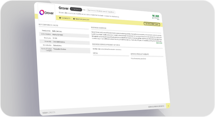 E-Commerce + 5 Ecommerce, Marketplaces & Classifieds Grover Grover offers a simple, monthly subscription model for the best in consumer electronics. Founded: 2015 https://www.grover.com/ See More at NOAH Connect KEY CORPORATE FACTS BUSINESS OVERVIEW Grover (Grover.com) is one of Europe’s market leaders in technology rentals, bringing the access economy to the consumer electronics market, Headquarters Berlin, Germany by offering a simple, monthly subscription model for the best in tech. Grover is the first financing company for the circular economy, breaking the Active Markets Austria, Germany link between ownership and use, and buying products, so people don’t have to. In Germany, private customers as well as businesses get access to a wide range of over 2,000 tech products including smartphones, laptops, virtual reality (VR) gear, and wearables, profiting from flexibility and… Employees 51-100 READ MORE Ownership Corporate Investors BUSINESS SERVICE/PRODUCT OFFERED Monetisation Subscriptions Monthly rental subscriptions for consumer electronics. Service/Product Transaction Services Category MEDIA SERVICE/PRODUCT WEBSITE https://www.grover.com/de-en NOAH LONDON SERVICE PROVIDER BOOK 3