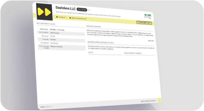 Engineering + 4 Dashdevs LLC DashDevs is an industry-leading software development company with almost 10 years on the market. Founded: 2011 https://www.dashdevs.com/ See More at NOAH Connect KEY CORPORATE FACTS BUSINESS OVERVIEW DashDevs has mastered a full range of delivery models ranging from small project outsourcing to offshore staffing and developing digital Headquarters Wilmington, United States bank from scratch on vendor terms. We deliver a variety of managed services to our clients, including the development of top-quality software Active Markets United Kingdom applications, quality assurance, testing, web systems design, and offshore staff augmentation. Employees 101-250 READ MORE Ownership Founders BUSINESS SERVICE/PRODUCT OFFERED Monetisation Commissions The DashDevs fintech solutions are powered by extensive hands-on industry experience and supported by advanced technical knowledge and Service/Product Financial Consulting a thorough understanding of rules and regulations. Category MEDIA SERVICE/PRODUCT WEBSITE NOAH LONDON SERVICE PROVIDER BOOK 2