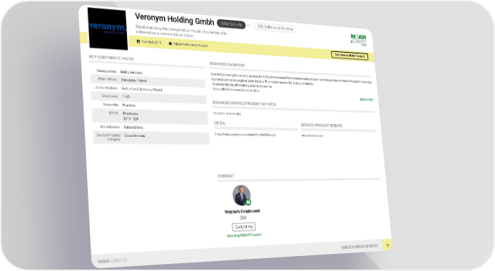 Cyber Security + 1 B2B Software & Services Veronym Holding Gmbh Revolutionising the consumption model of cybersecurity- delivered as-a-service subscription Founded: 2018 https://www.veronym.com See More at NOAH Connect KEY CORPORATE FACTS BUSINESS OVERVIEW Comprehensive cyber security services for SMEs democratised from market leaders trusted technologies hand in hand with expert knowledge Headquarters Berlin, Germany to protect companies against cyber threats. The modern answer for today’s complexity Other Offices Warszawa, Poland - Scalable, flexible, affordable subscription service - Accessible from anywhere at anytime Active Markets Switzerland, Germany, Poland READ MORE Employees 11-25 BUSINESS SERVICE/PRODUCT OFFERED Ownership Founders to secure connectivity KPI #1 Employees 2019 - 22# MEDIA SERVICE/PRODUCT WEBSITE Monetisation Subscriptions https://www.youtube.com/watch?v=lXIaSVMdxtA www.veronym.com Service/Product Cloud Services Category CONTACT Wojciech Gołębiowski CEO Contact me Attending NOAH19 London NOAH LONDON SERVICE PROVIDER BOOK 15