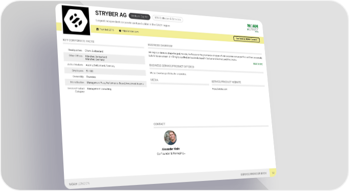 Venture Capital B2B Software & Services STRYBER AG Largest independent corporate venture builder in the DACH region Founded: 2016 http://stryber.com See More at NOAH Connect KEY CORPORATE FACTS BUSINESS OVERVIEW We help our clients to shape the goal, the size, the focus and the governance structure of their corporate venture portfolio and then, we actually Headquarters Cham, Switzerland build it. We are a team of >70 highly qualified professionals based in Switzerland, Germany and the Ukraine. Other Offices München, Switzerland READ MORE München, Germany BUSINESS SERVICE/PRODUCT OFFERED Active Markets Austria, Switzerland, Germany We build venture portfolios for corporates. Employees 51-100 Ownership Founders MEDIA SERVICE/PRODUCT WEBSITE Monetisation Management Fees, Performance Based, Investment Income https://stryber.com Service/Product Management Consulting Category CONTACT Alexander Mahr Co-Founder & Managing… NOAH LONDON SERVICE PROVIDER BOOK 14