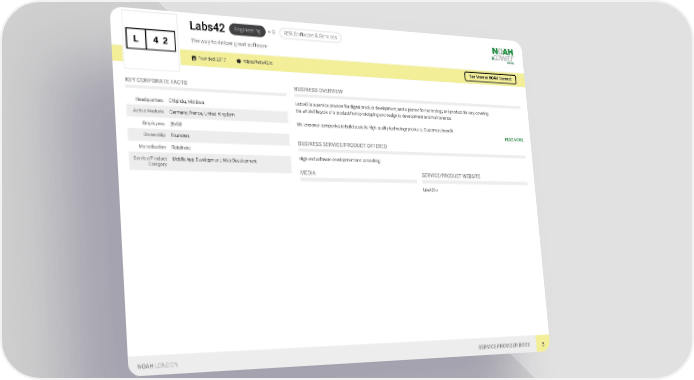 Engineering + 3 B2B Software & Services Labs42 The way to deliver great software Founded: 2017 https://labs42.io See More at NOAH Connect KEY CORPORATE FACTS BUSINESS OVERVIEW Labs42 is a service provider for digital product development, and a partner for technology and product delivery covering Headquarters Chișinău, Moldova the whole lifecycle of a product from prototyping and design to development and maintenance. Active Markets Germany, France, United Kingdom We empower companies to build scalable high-quality technology products. Customers benefit Employees 26-50 READ MORE Ownership Founders BUSINESS SERVICE/PRODUCT OFFERED Monetisation Retainers High end software development and consulting. Service/Product Mobile App Development, Web Development Category MEDIA SERVICE/PRODUCT WEBSITE labs42.io NOAH LONDON SERVICE PROVIDER BOOK 5